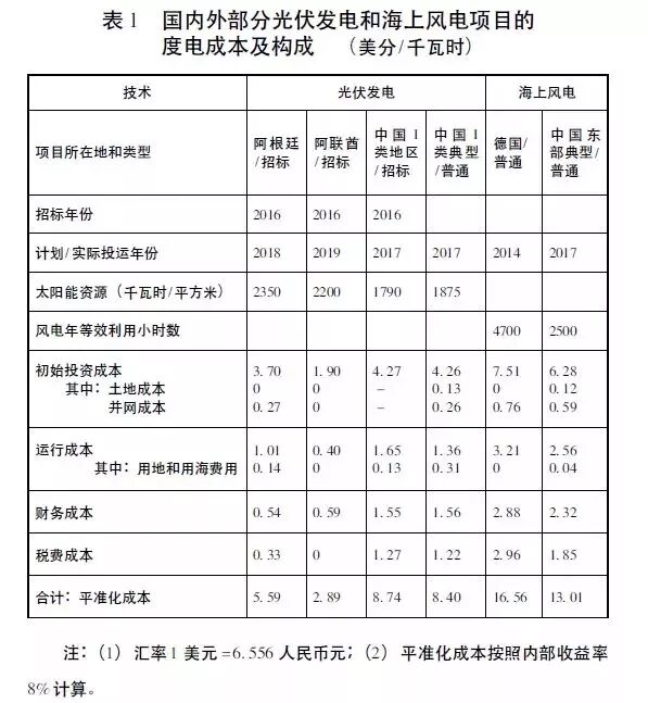 比较上述电价水平,可以看出,我国可再生能源电价与国际相比整体上处于偏高水平。表1列出了根据调研数据测算的国内外部分光伏发电和海上风电项目的平准化成本及构成。通过对比分析,影响可再生能源发电项目成本和造成国内外电价差异的因素主要在以下几个方面。